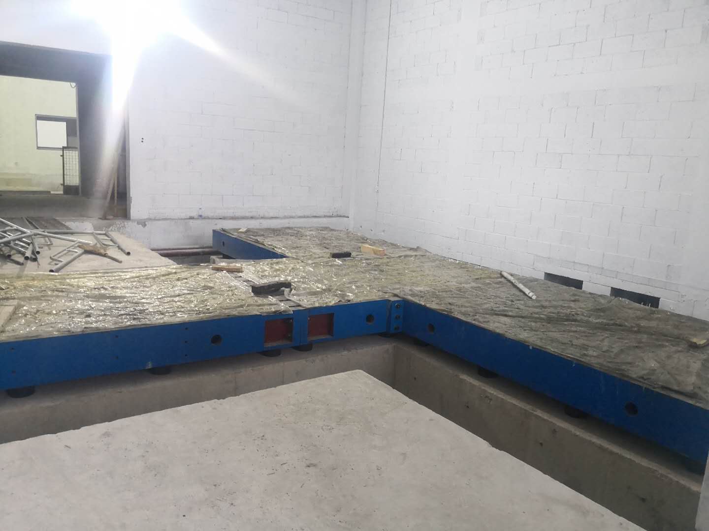 1.将调整垫铁放置在适当的位置,将螺栓放置在地基预留的孔里,平板吊到位后,在适当高度将螺栓投入底脚螺栓孔内,拧上螺母放在垫板上,找正位置取下划座上的固定装置,将平板擦干净。